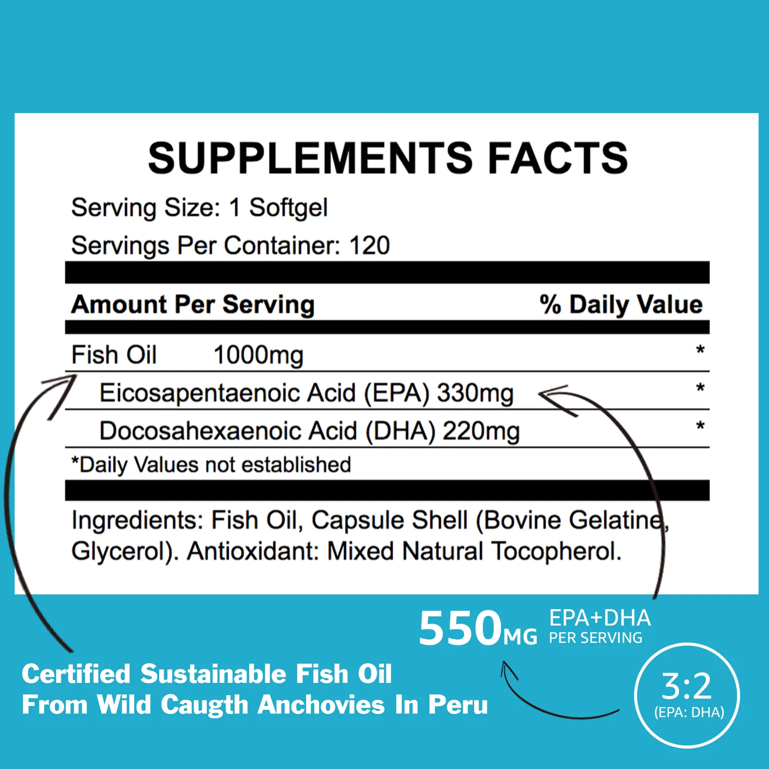Distilled Serving Size: 2 Soft Gels (60 Servings) Fish Oil 2000mg