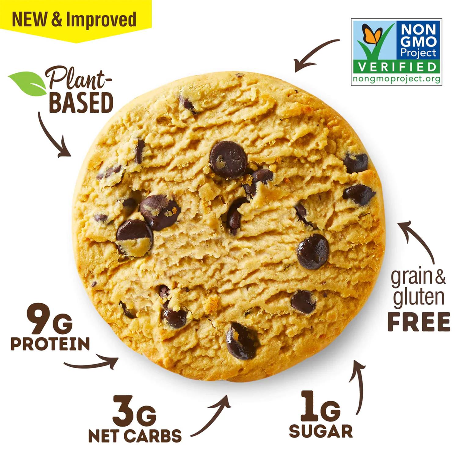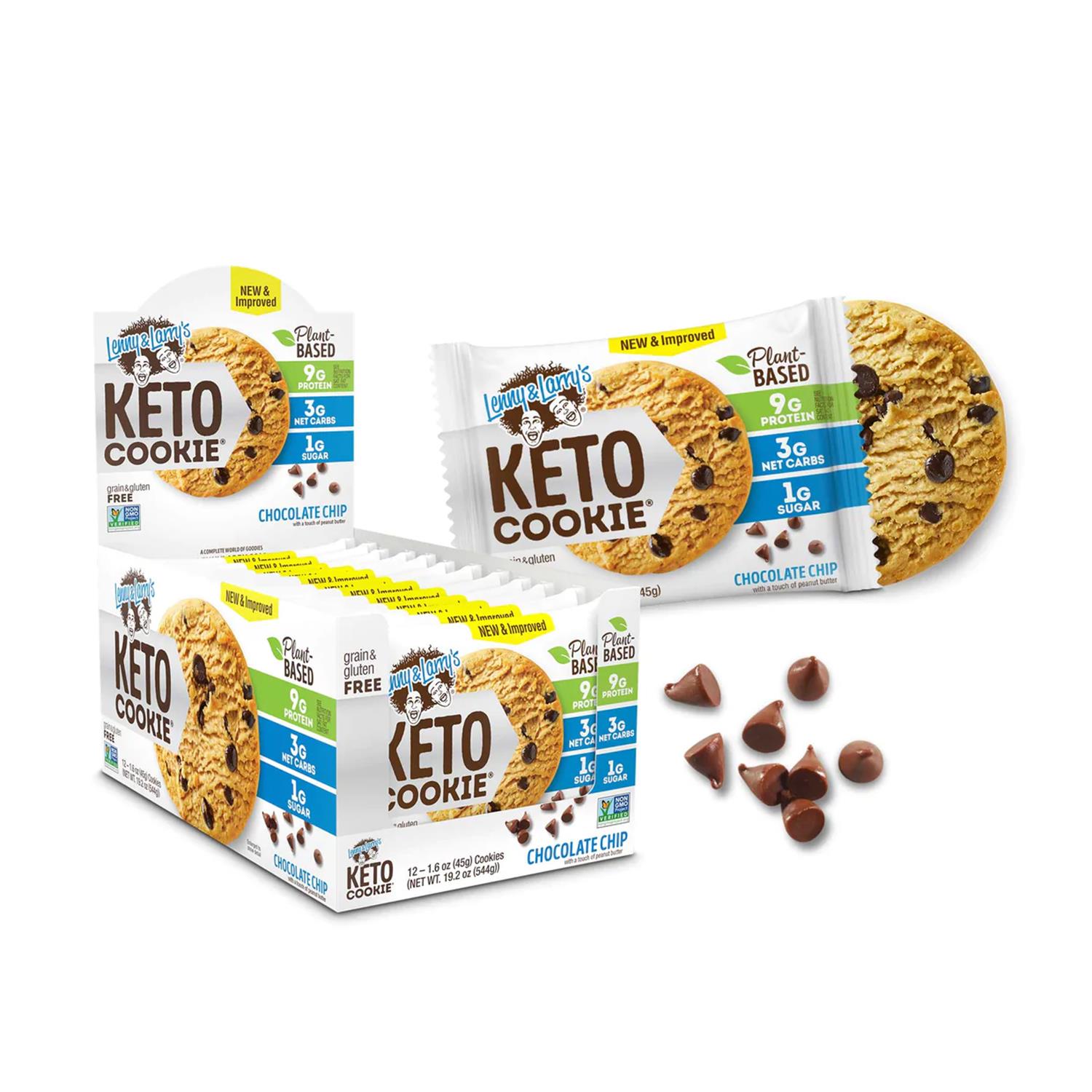 Our new and improved Chocolate Chip Keto Cookie has 9g of plant-based proteins, 3g net carbs, and 1g of sugar. With a touch of peanut butter added in, you will love every bite of this low-carb, vegan treat. A unique blend of creamy chocolate chips, our delectable Chocolate Chip vegan protein cookie has only 3g net carbs. It is sweeter, has a stronger chocolate chip flavor, and has a moister texture than before. With 9g of plant-based proteins and 5g of fiber, this cookie will not only satisfy your tummy & sweet tooth but also meet your nutritional needs. Lenny & Larry‚Äôs Keto Cookie is grain & gluten free, Non-GMO Project Verified, and vegan . We don‚Äôt use dairy, soy, eggs, high fructose corn syrup or artificial sweeteners in any of our Keto Cookies. FACTS Grain & Gluten Free 9g Plant-Based Proteins 3g Net Carbs 1g Sugar 5g Fiber No Egg No Soy Ingredients No Dairy Ingredients Non-GMO Project Verified No high fructose corn syrup No Artificial Sweeteners Sustainable Palm Oil INGREDIENTS. Palm Fruit Oil (sustainably sourced), Sugar Free Chocolate Chips (chocolate liquor, cocoa butter, sunflower lecithin, natural vanilla extract), Peanut Butter (roasted peanuts), Protein Blend (pea protein, almond protein), Chicory Root Fiber, Organic Erythritol, Grain Free Flour Blend (lupin flour, arrowroot flour), Vegetable Glycerine, Natural Flavor, Xanthan Gum, Baking Soda, Sunflower Lecithin, Stevioside (stevia extract), Salt, Mixed Tocopherols ALLERGENS Contains Lupin, Almond and Peanut. *Manufactured in a facility that also processes Peanut, Tree Nut, Soy, Milk, Egg, and Wheat. Our new and improved Chocolate Chip Keto Cookie has 9g of plant-based proteins, 3g net carbs, and 1g of sugar. If you are living gluten-free, eating keto or just watching your sugar, you will love every bite of this low-carb, vegan treat. Our new Keto cookie is sweeter, has a stronger chocolate chip flavor, and has a moister texture than before. Rich chocolate chips and a touch of peanut butter, give our low-carb, plant-based Chocolate Chip Keto Cookie a flavor that is sure to satisfy any snack time craving. Not only do our Keto Cookies taste great but they are also packed with plant-based proteins and provide an excellent source of fiber. You’ll feel full for longer while meeting your nutritional needs. In addition to our popular Chocolate Chip Keto Cookie, we also have another craveable Peanut Butter flavor.