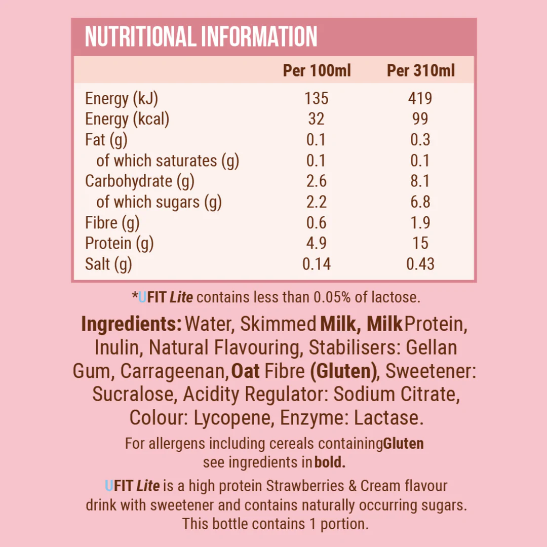 WHAT’S INSIDE? 15g essential protein Only 99 calories Fat Free No added sugar Lactose Free 100% Natural flavours and colours Ingredients *Based on UFIT Lite Strawberries and Cream Ingredients: Water, Skimmed Milk, Milk Protein, Inulin, Natural Flavouring, Stabilisers: Gellan Gum, Carrageenan, Oat Fibre (Gluten), Sweetener: Sucralose, Acidity Regulator: Sodium Citrate, Colour: Lycopene, Enzyme: Lactase.