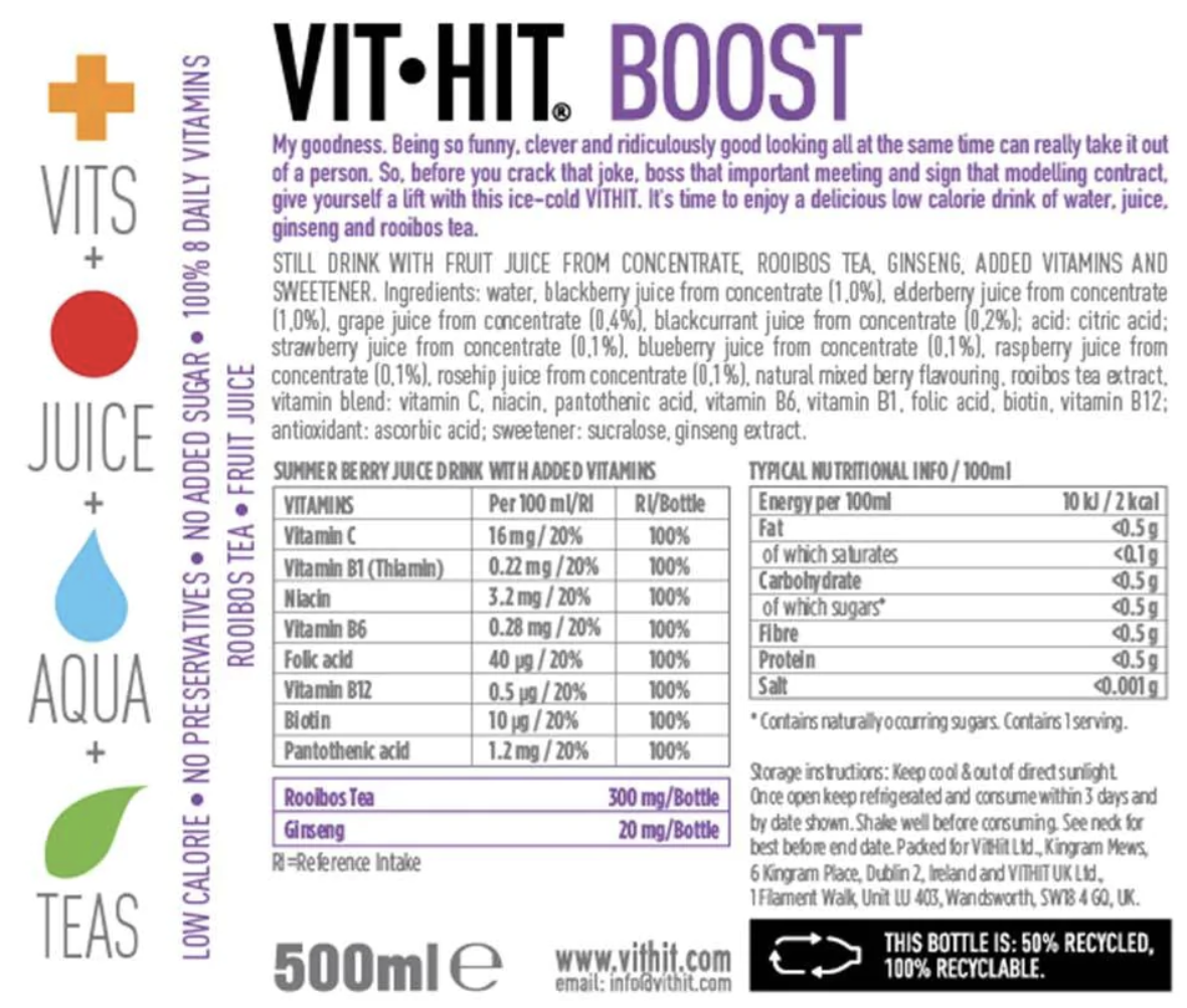 A flavour-filled blend of summer berries, fused with water and a powerful injection of ginseng and rooibos tea, VITHIT Boost is a great tasting source of your daily vitamins in an easily consumable energy-providing drink. Each bottle contains less than 6g of sugar and has less than 35kcal! And with no artificial colours or preservatives, VITHIT is great as a source of energy when you need a recharge. So what are you waiting for? Get your hands on VITHIT Boost today! And give your workouts or training sessions the kick they need. It’s time you tried the delicious low calorie VITHIT sensation that our fans can’t get enough of.